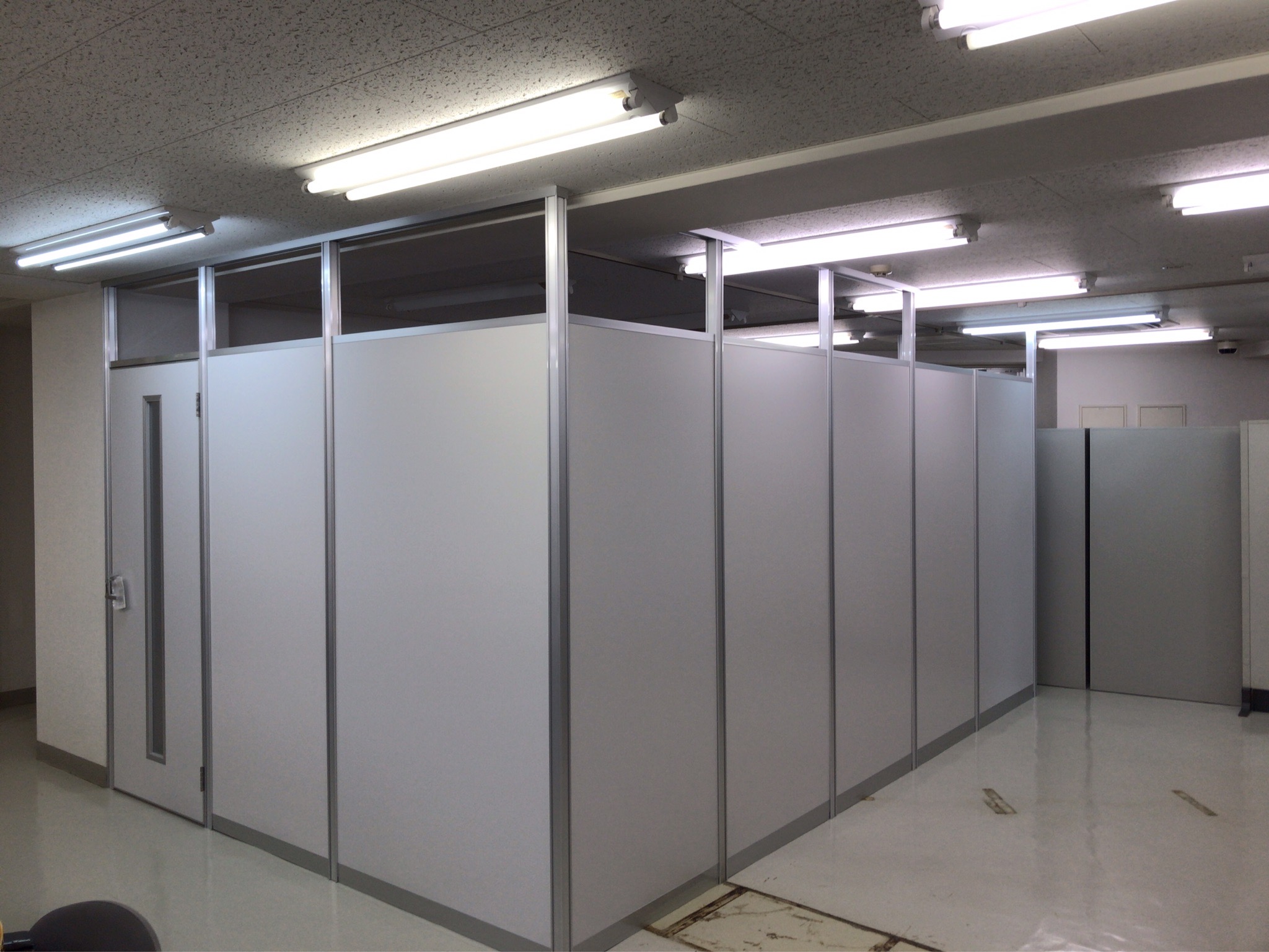 現在ロッカー書庫で部屋を作っていて、パーテーションで区切りたい、遮音は特に必要ないとの事、新品アルミパーテーションでご提案しました。価格を抑えた提案に喜んでいただきました、工事日が社内調整が上手く決まらなかったですが、細かく時間等も伝えて許可を頂きました。