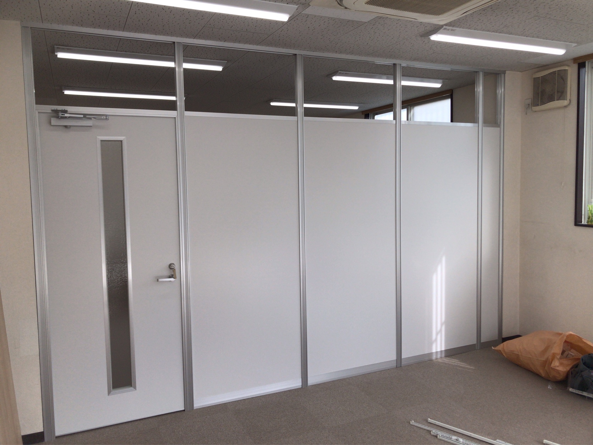 今回はオフィスフロアと打合せフロアを分けたい、別に声等が漏れても問題なし、消防法や空調にも影響がない様にして欲しいとの事なので、新品アルミパーテーション工事をお勧め致します、価格もローコストで行けて、施工は直営施工班がいますので最短施工も可能でご希望通りに出来ました!