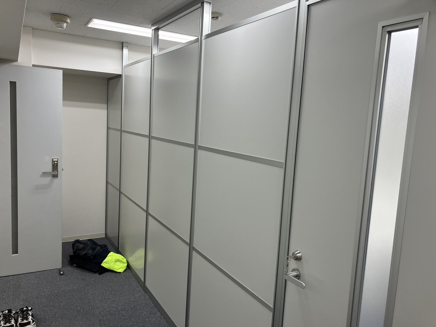 今回はオフィスフロアとエントランを分けたい、別に声等が漏れても問題なし、消防法や空調にも影響がない様にして欲しいとの事なので、中古アルミパーテーション工事をお勧め致します、価格もローコストで行けて、施工は直営施工班がいますので最短施工も可能でご希望通りに出来ました!