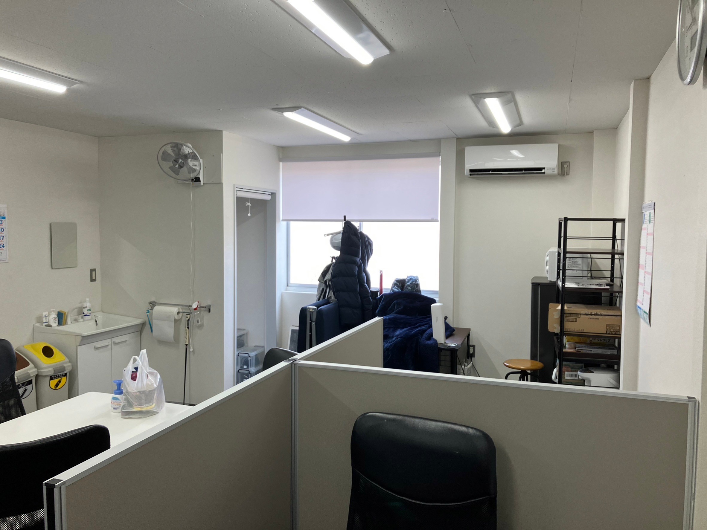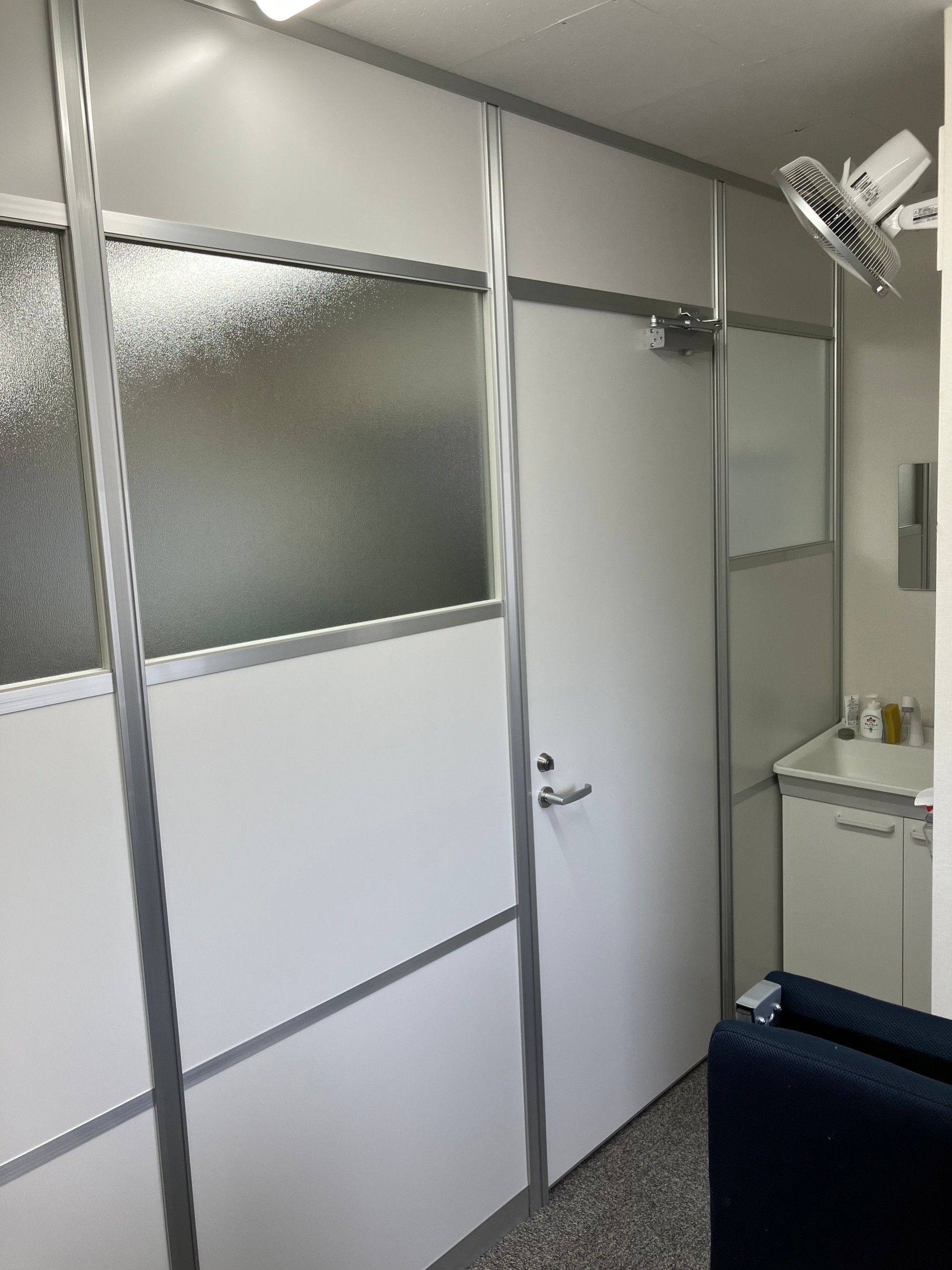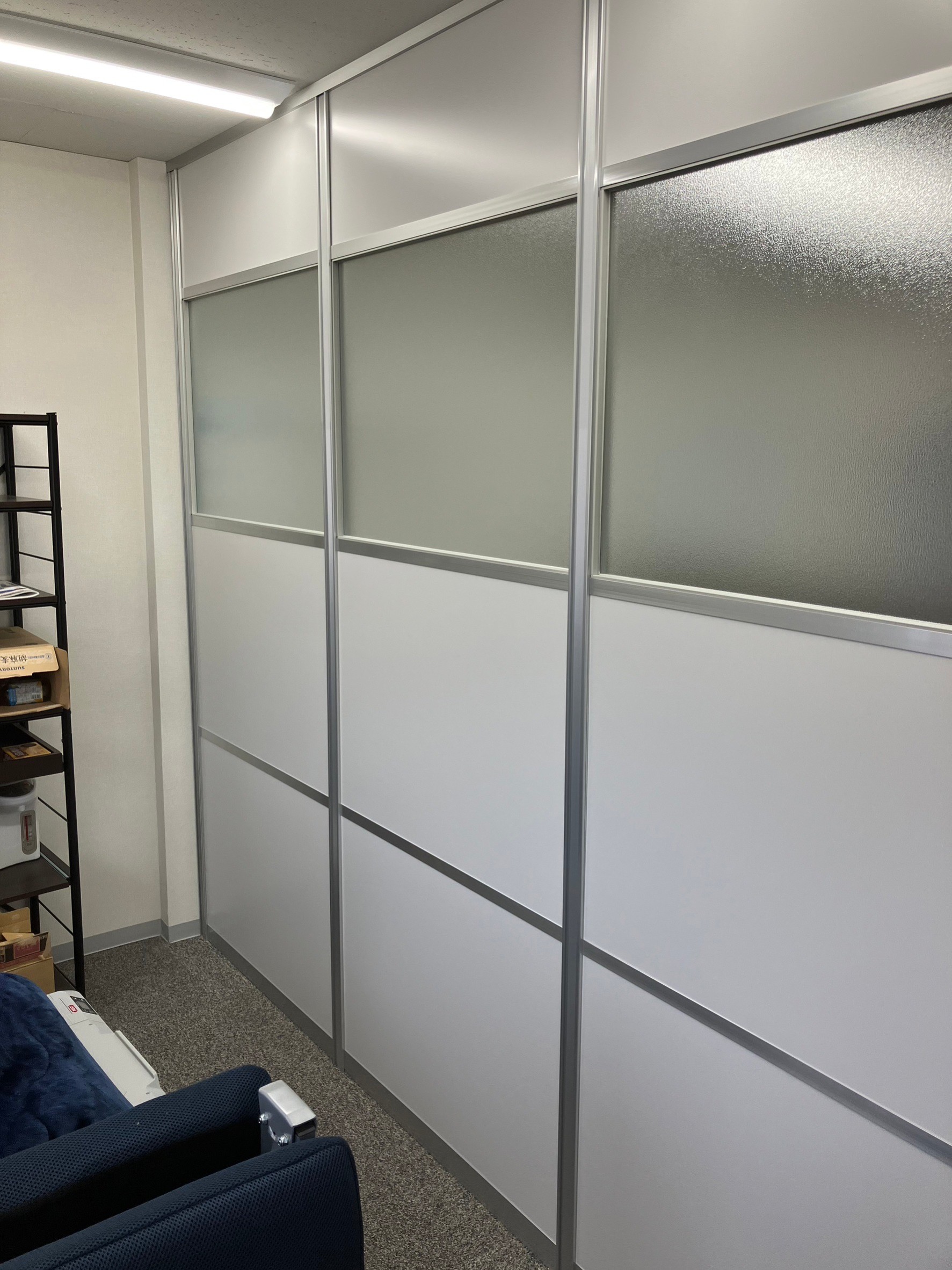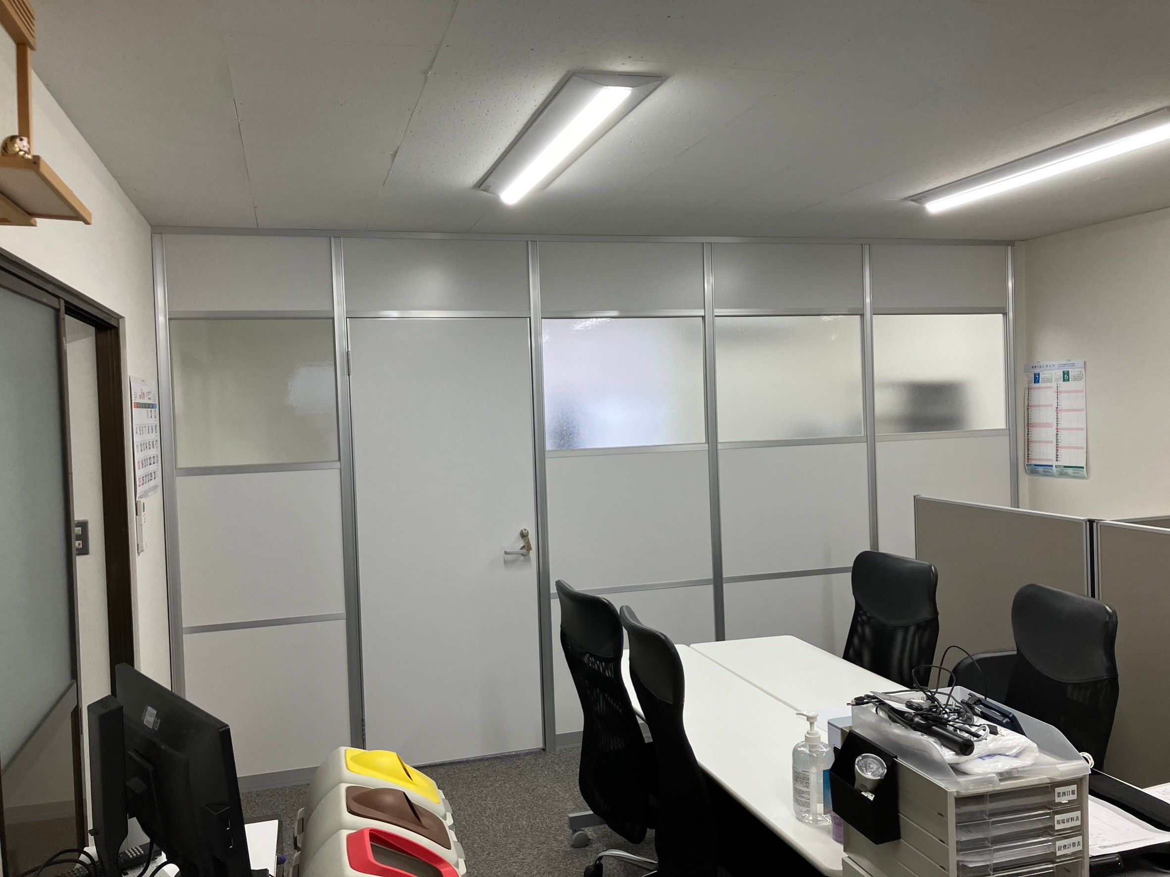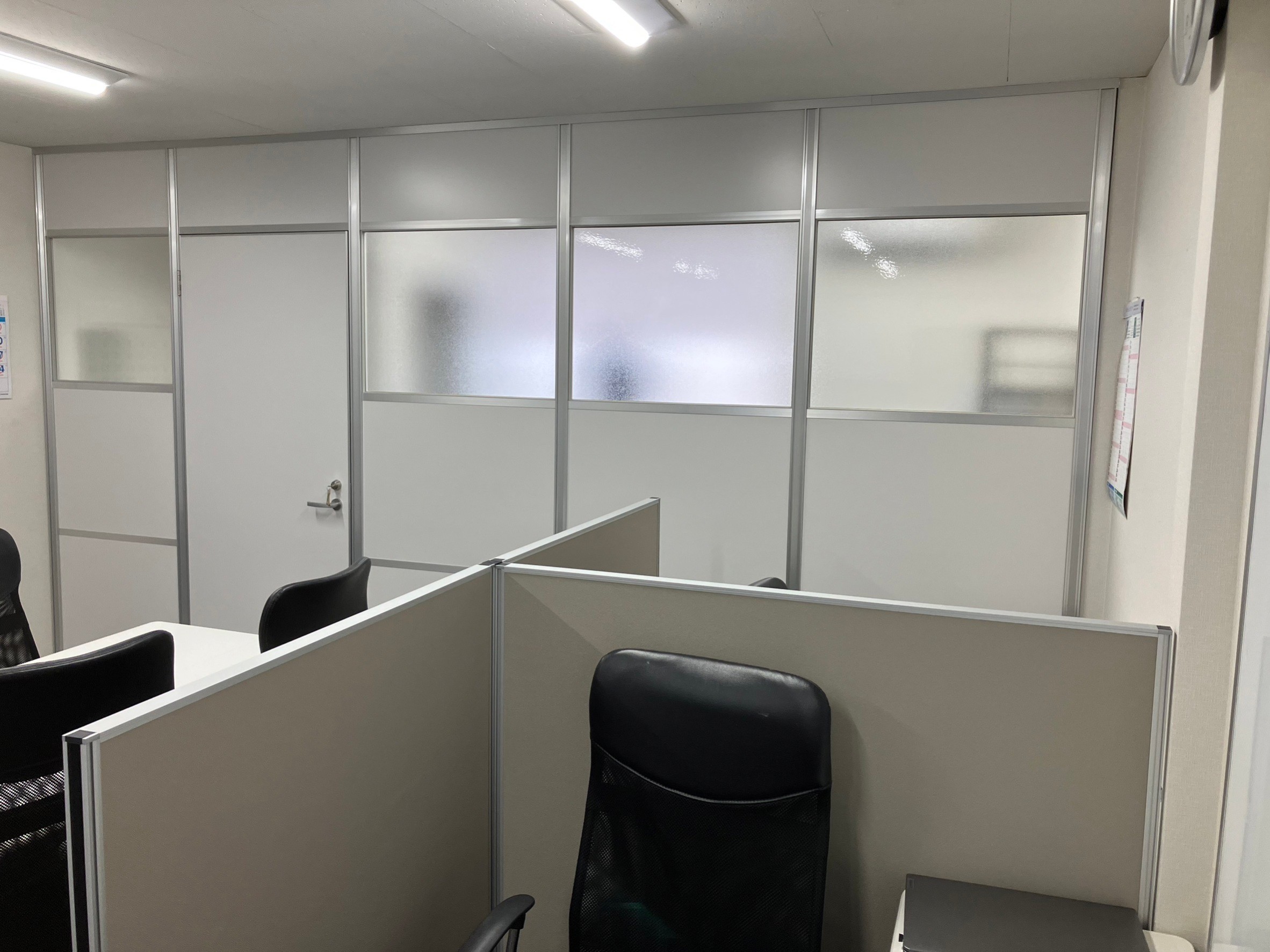 既存オフィスに打合せと執務室を分けたい、音は気にしないので、何かあるか相談したら、デザイン・価格・工事日とスムーズに決まりましたので、パーテーション職人さんにお願いすれば間違いなし!!