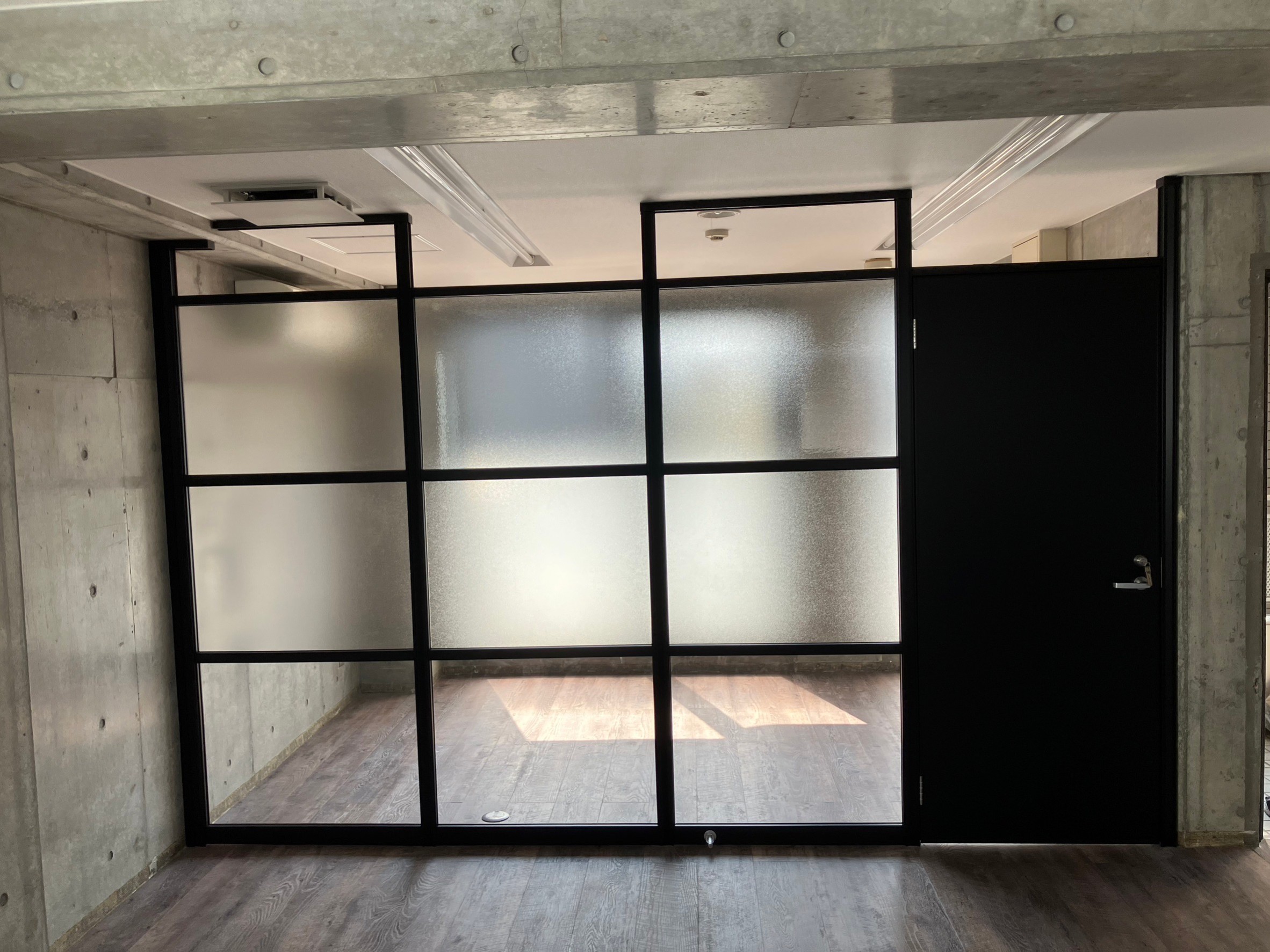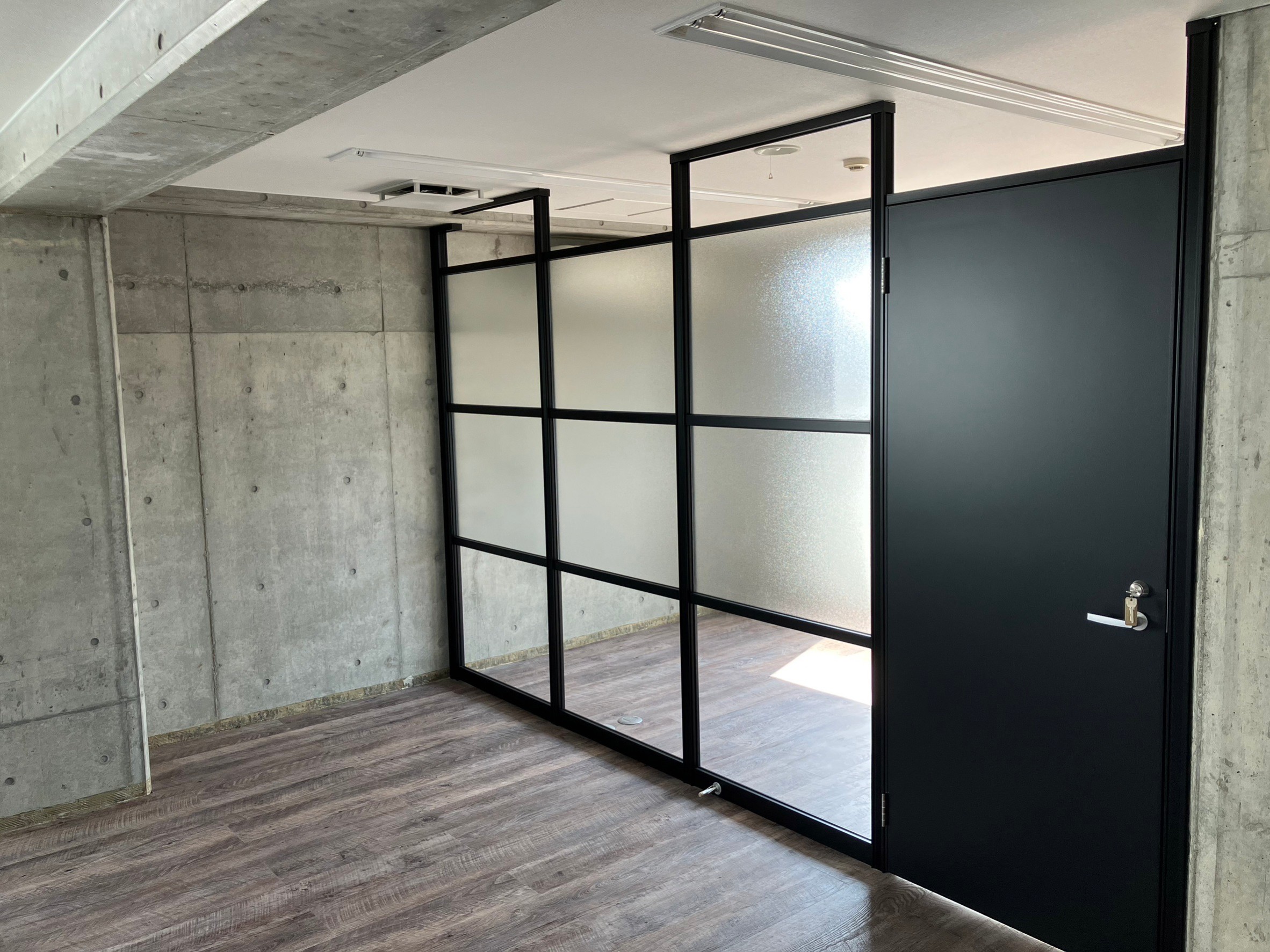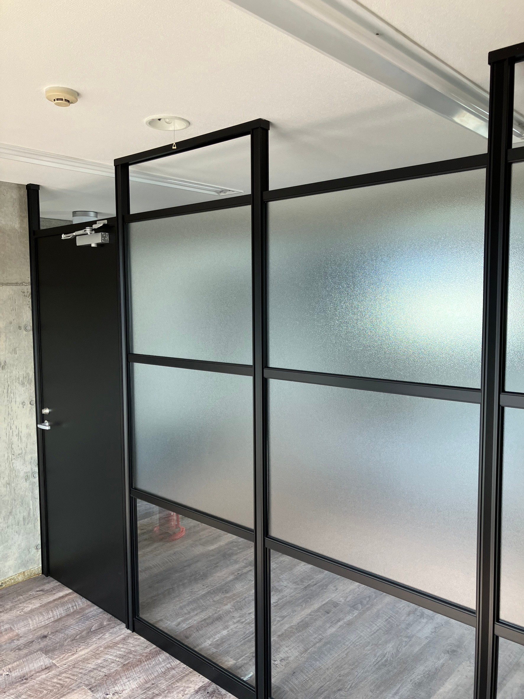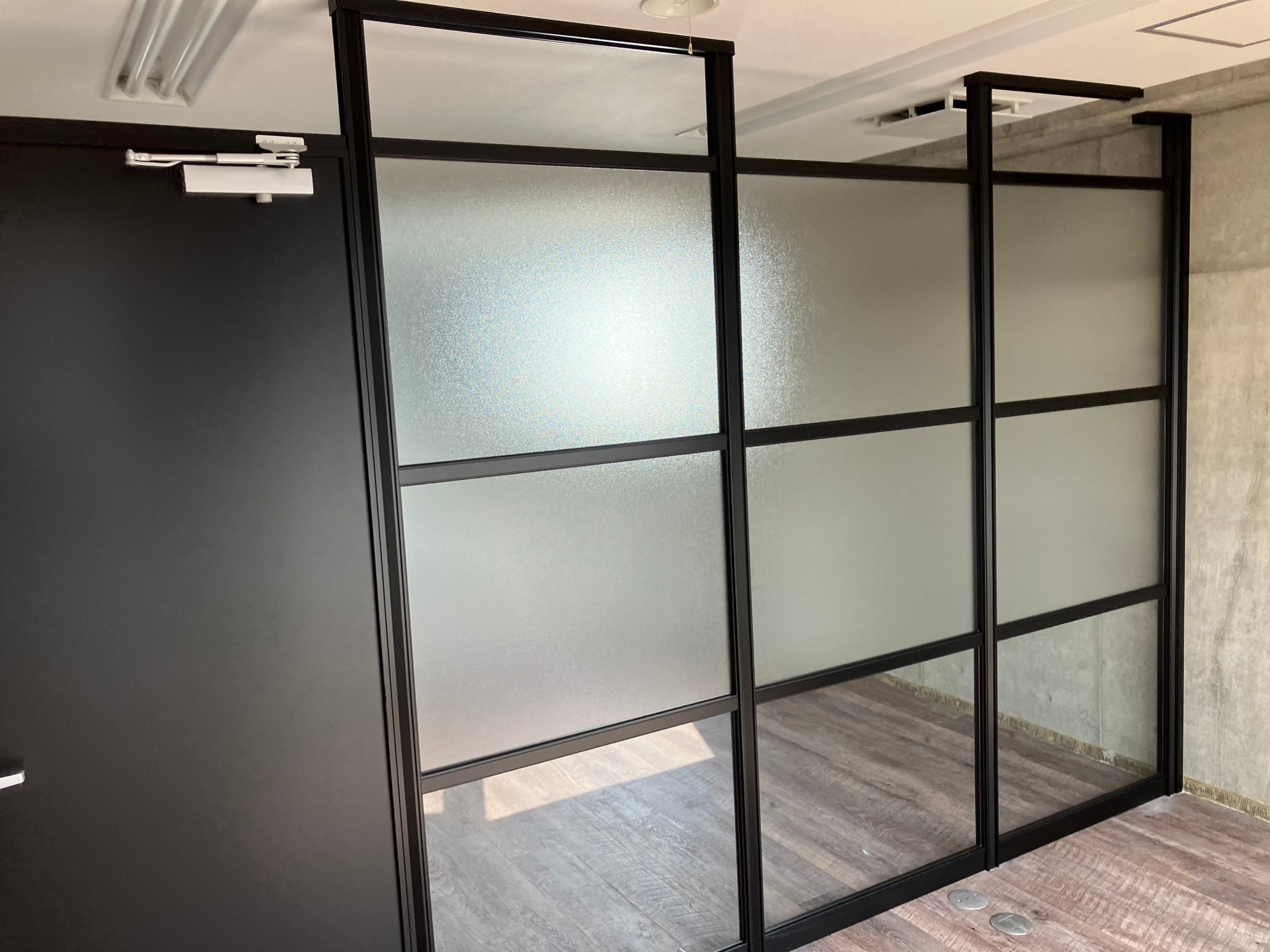 以前買って頂きました、お客様よりご紹介で、ありがとうございます!デザイン重視アルミパーテーション工事でさらにガラスを加えてご提案させて頂きました、他社と比べても安かったです。