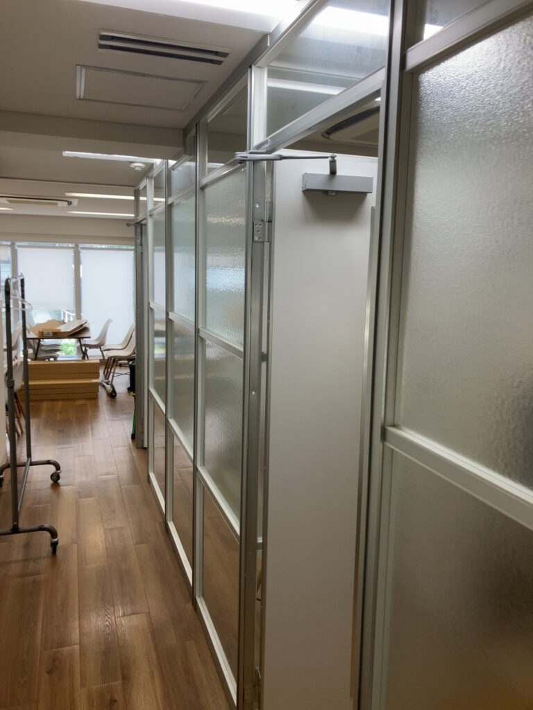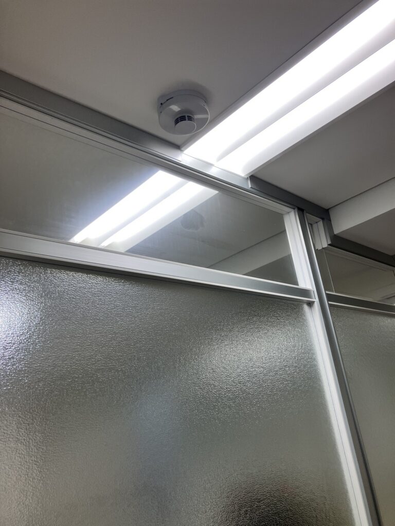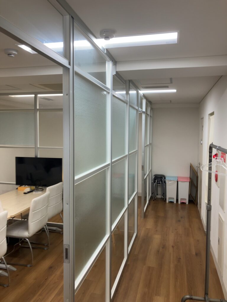 前回会議室を2部屋作っていただいた経緯で、今回は管理会社から蛍光灯LEDに変更する為、パーテーションを一部解体組立して頂きました、点数は、、、ごめんなさい見てないので合格点って事でお願いします、