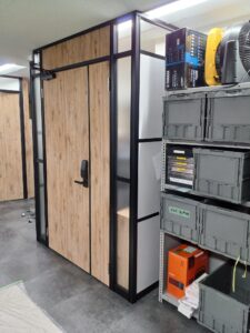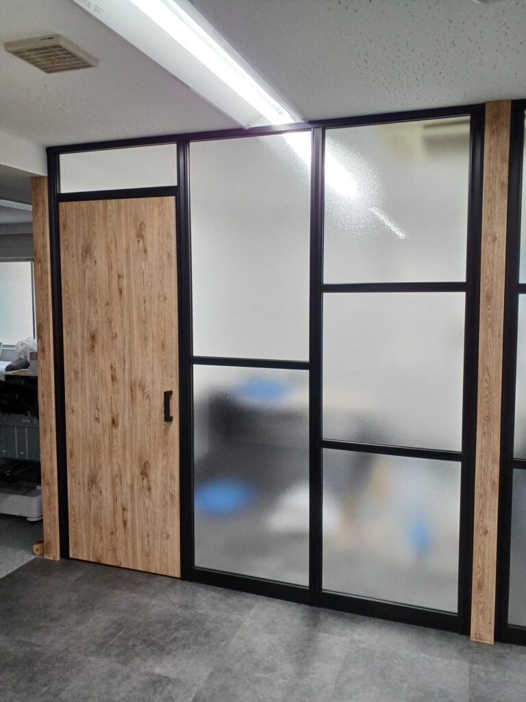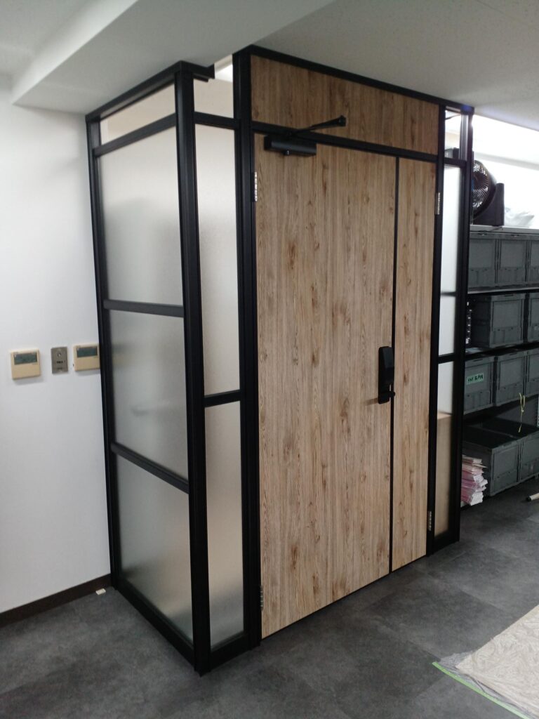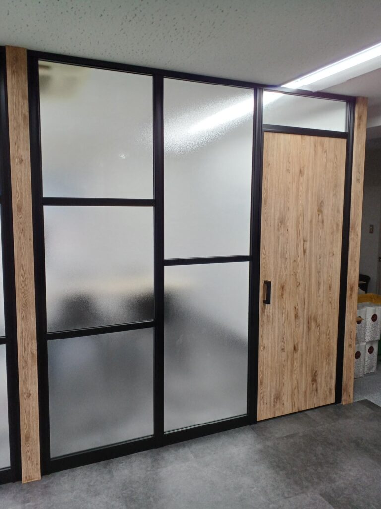 見た目がメインで、デザイナーさんとエンドユーザー様といろいろ打合せし、ご要望通りの内容に出来て良かったです。デザイン重視の為、ガラス割りやドアのサイズ、天井までの仕様が異なるので、施工には十分注意しながら行いました。