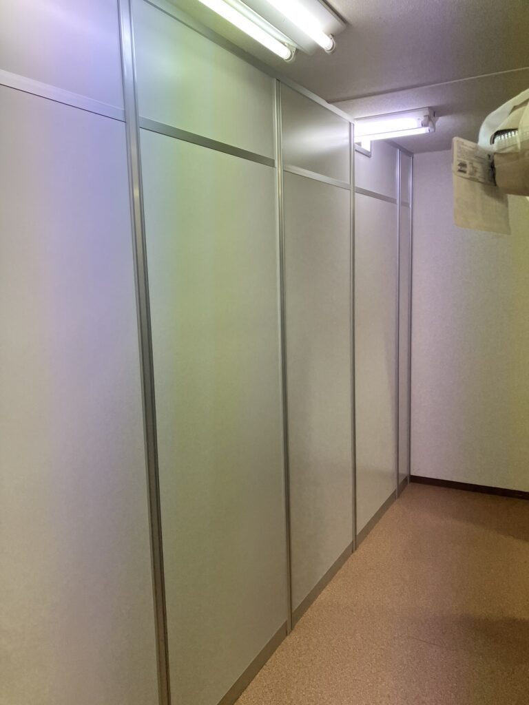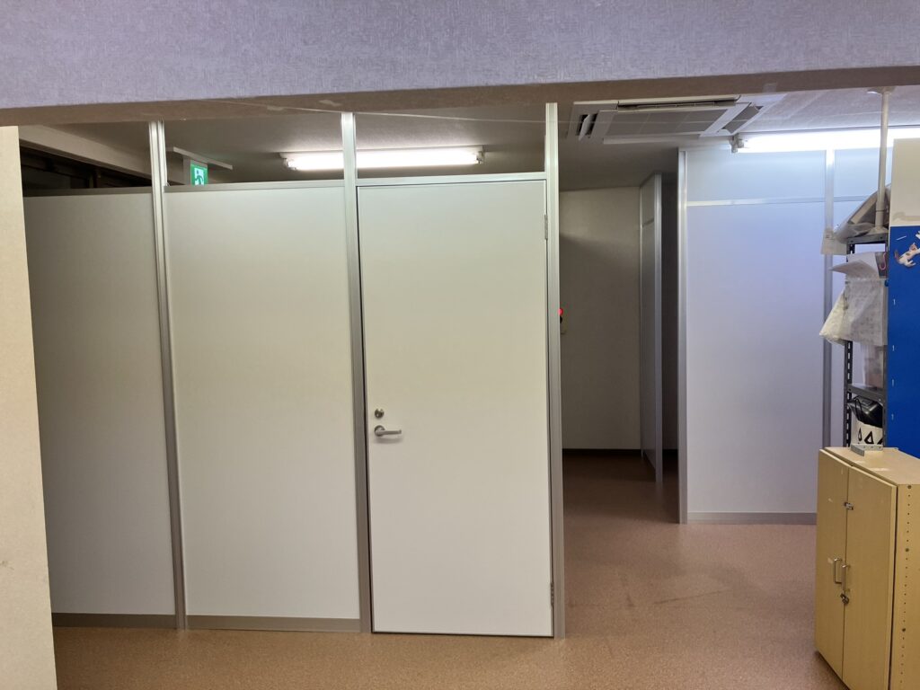 他の教室と見え方が、変わらない様に、またこの教室だけのご要望もお聞きして一部ランマパネルで、アルミパーテーションでご提案しました。子供の預かる施設・教室なので、パーテーションに細かい切りカスや床に鉄くず等ない様に、クリーニングはシッカリ行いました。