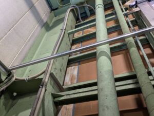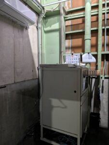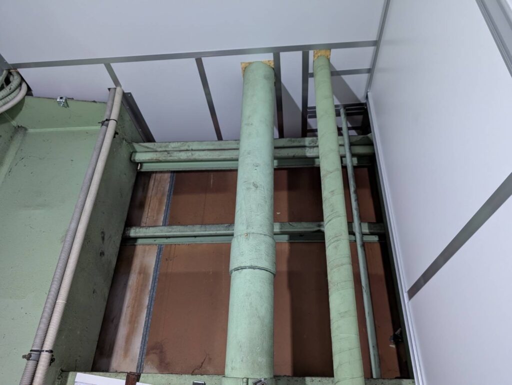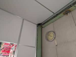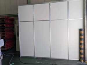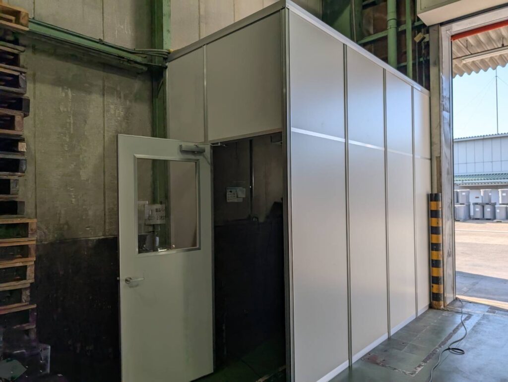 倉庫に簡易事務所を設置したい、エアコンを効かせたいのご要望、アルミパーテーションのフォクトリーブースをご提案しました、エアコンも効きますし天井が高い倉庫には最適と判断しました。倉庫の既存の壁を利用したファクトリーブース工事の為、壁には配管やH鋼、配線等あり、加工が大変でしたが、邪魔にならない場所を選びながら設置しました
