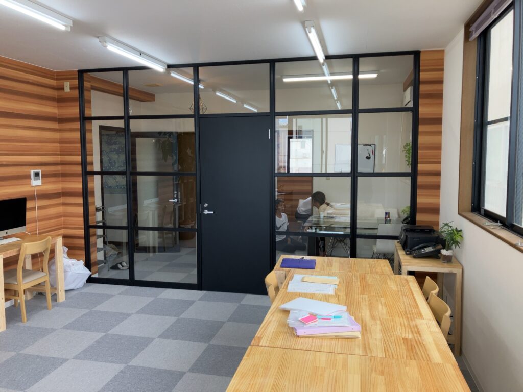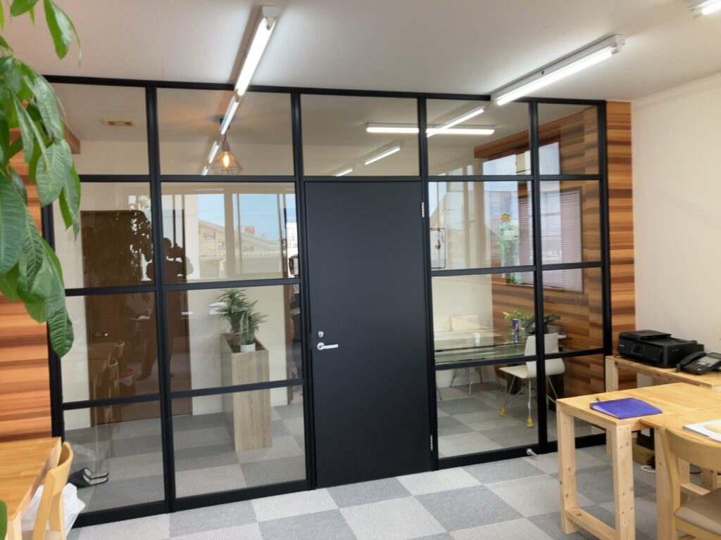 内装が木目調のオフィスなので、ブラック型材アルミパーテーションでご提案し、おしゃれでかっこいいオフィスに仕上がりました。