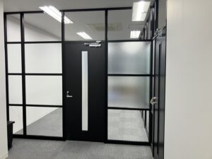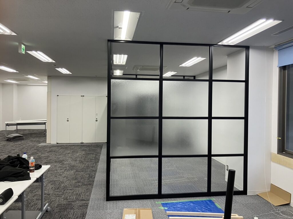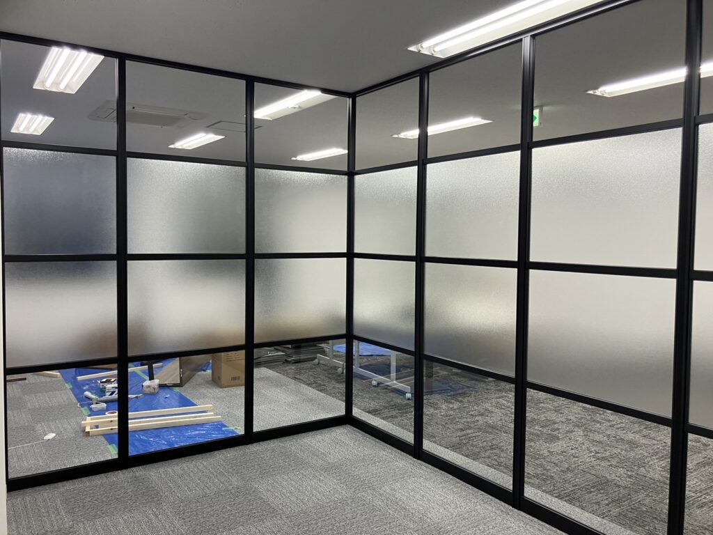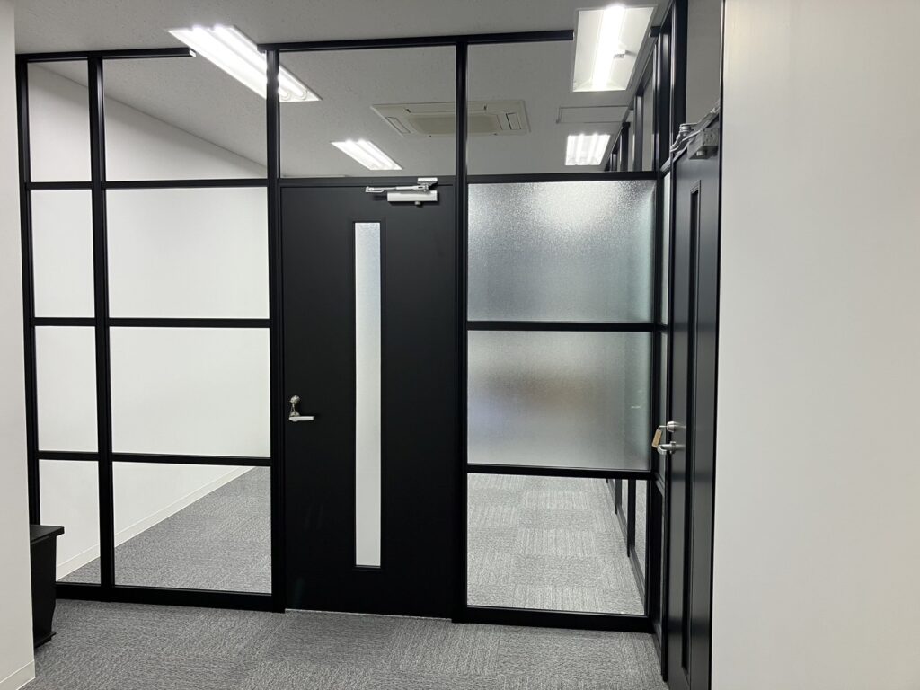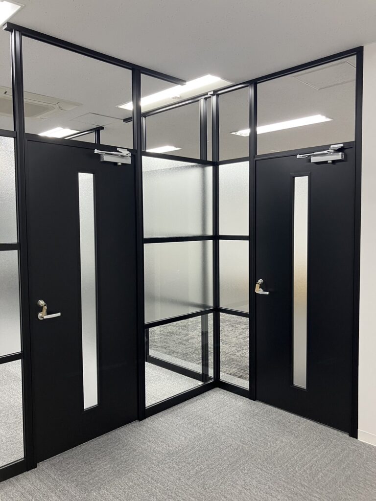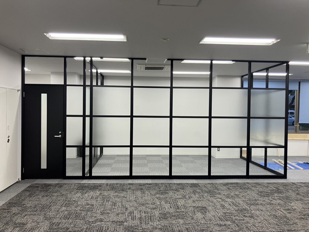 パーテーションで会議室をご提案、ガラスとブラック型材でワンランク上のオフィス作りをご提案しました