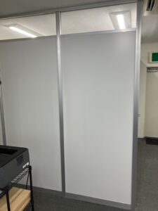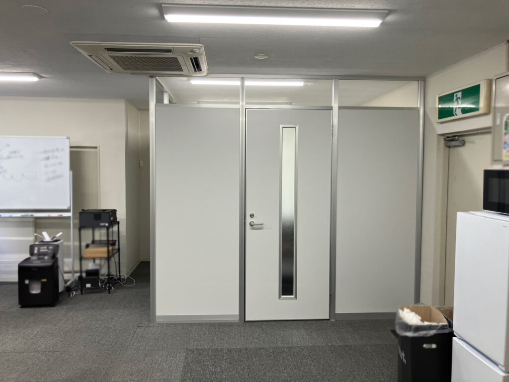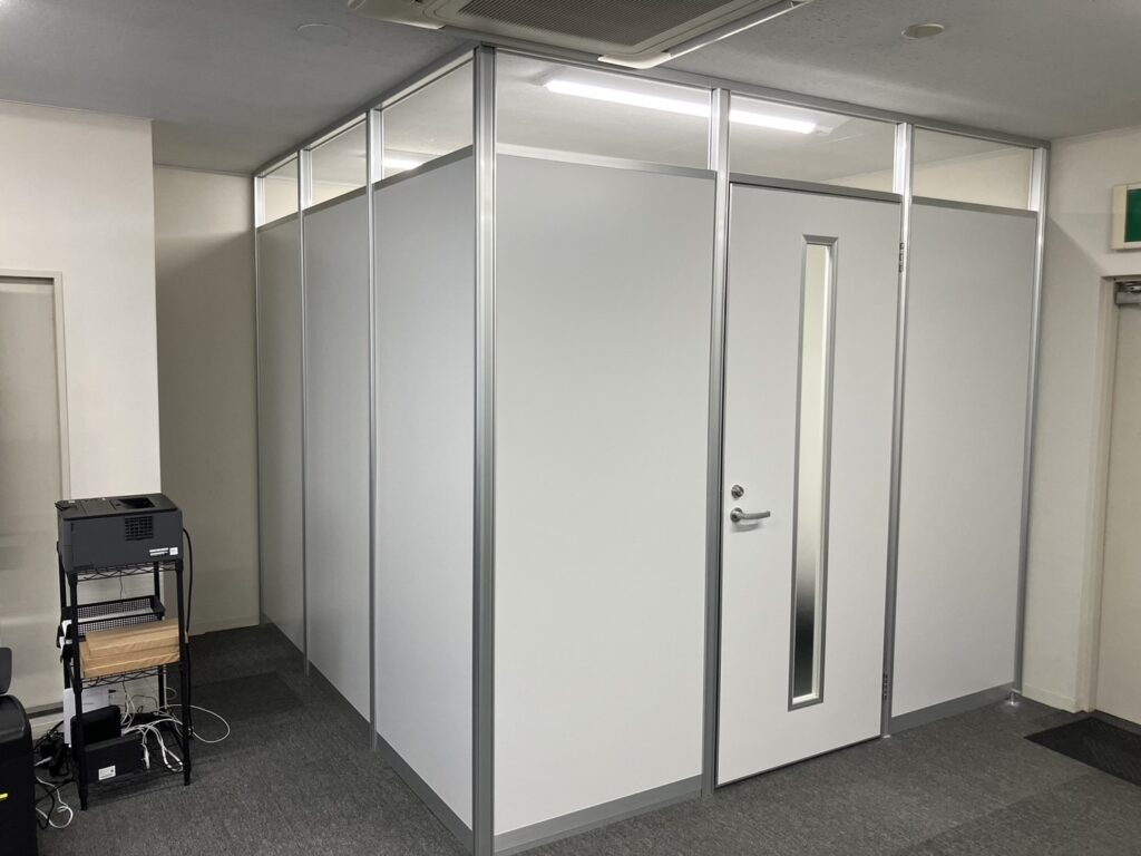 今回初めてのパーテーション、価格は安く、ドアはスリットでご提案しっかりした会議室をご提案致しました。