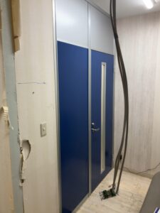 既存の壁のレイアウト変更でホコリや工事現場が見えない様にパーテーション設置、中古アルミパーテーションで最安値でご提案致しました。