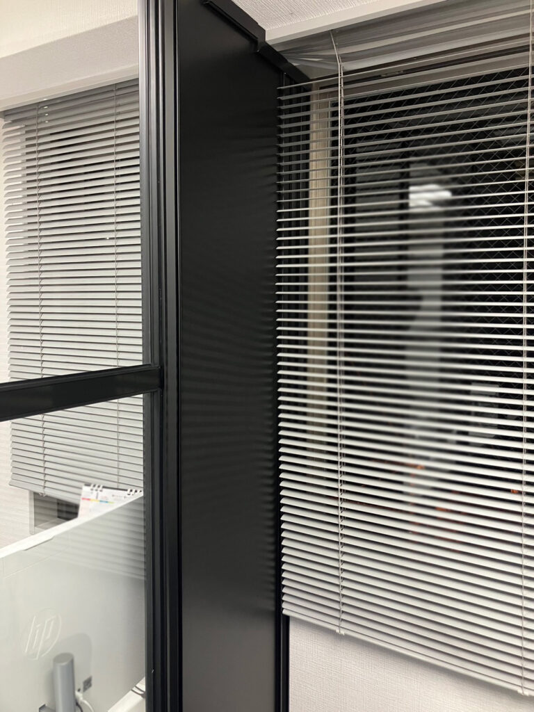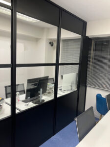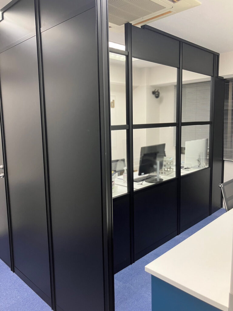 狭小スペース、部屋の真ん中にエアコン、どちらかが狭くならない様にがポイント、、、アルミブラック型材3段ブロックガラスのご提案で狭いオフィスを少しでも広く見せました